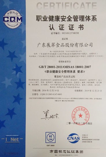 食品安全管理體系認(rèn)證證書