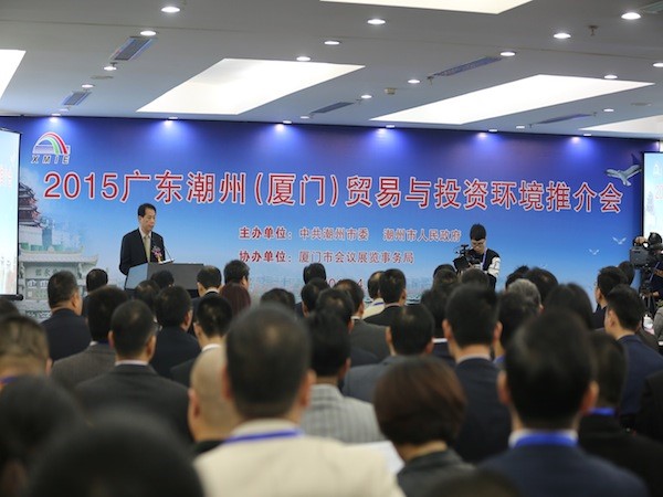2015年4月12日,廣東潮州(廈門)貿(mào)易與投資環(huán)境推介會(huì)在廈門國(guó)際會(huì)議展覽中心成功舉辦,會(huì)上共有29個(gè)項(xiàng)目簽約,總投資額達(dá)132.4億元,涵蓋交通、港口、衛(wèi)浴、旅游、食品等產(chǎn)業(yè)。廈門市副市長(zhǎng)國(guó)桂榮,漳州市副市長(zhǎng)黃慶輝,潮州市委書(shū)記李水華,市委副書(shū)記、市長(zhǎng)盧淳杰,潮州市各縣區(qū)、各有關(guān)部門領(lǐng)導(dǎo),有關(guān)商協(xié)會(huì)負(fù)責(zé)人、企業(yè)家代表、嘉賓共計(jì)250人出席了推介會(huì)。標(biāo)志著我市積極實(shí)施“走出去,引進(jìn)來(lái)”戰(zhàn)略,主動(dòng)融入海西經(jīng)濟(jì)區(qū),推動(dòng)潮閩臺(tái)經(jīng)貿(mào)協(xié)同發(fā)展,促進(jìn)區(qū)域經(jīng)濟(jì)交流合作,著力打造21世紀(jì)海上絲綢之路新起點(diǎn)又取得新的成果。