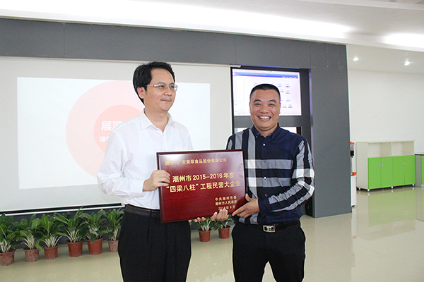 活動中,殷市長代表市委市政府為我司頒發(fā)了“潮州市2015-2016年度‘四梁八柱’工程民營大企業(yè)”牌匾。